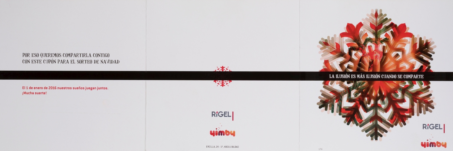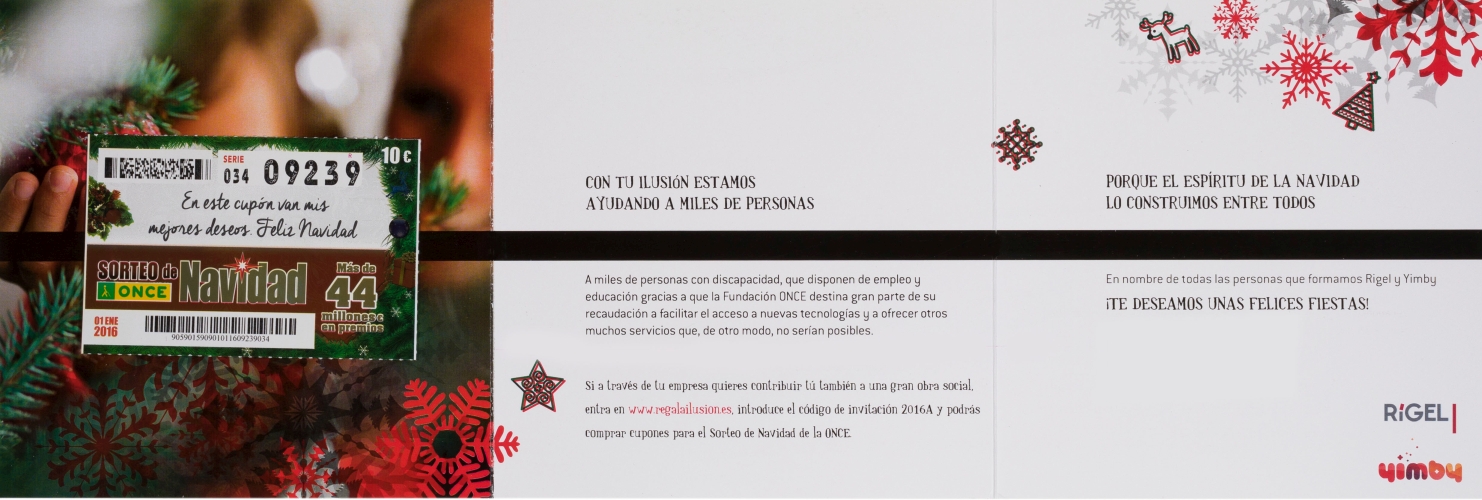 La ilusión es más ilusión cuando es compartida. Igual que la Navidad es más Navidad cuando la celebramos con los nuestros. En la felicitación de ese año 2015 quisimos compartir con nuestro círculo de clientes y amigos la ilusión de un cupón para el primer Sorteo de Navidad de la ONCE. Con la esperanza de cumplir sus propios deseos, nuestros destinatarios estaban ayudando a cumplir también los de las personas que más lo necesitaban.